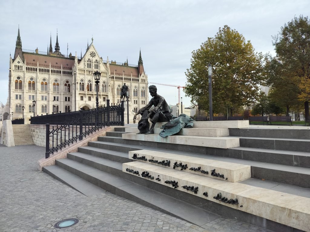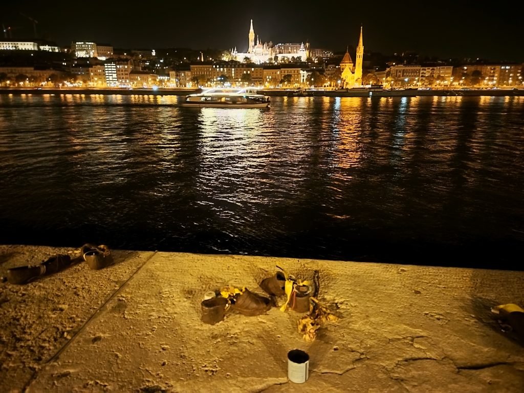 We continue our walk overlooking the Danube. We stay on the Parliament side and find after a few meters the famous art installation of Shoes on the Danube bank, a recently created Holocaust memorial by director Can Togay and sculptor Gyula Pauer. We also glimpse on the opposite side of the river the Buda Castle and Fishermen’s Bastion, both well lit.