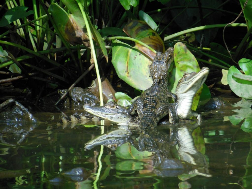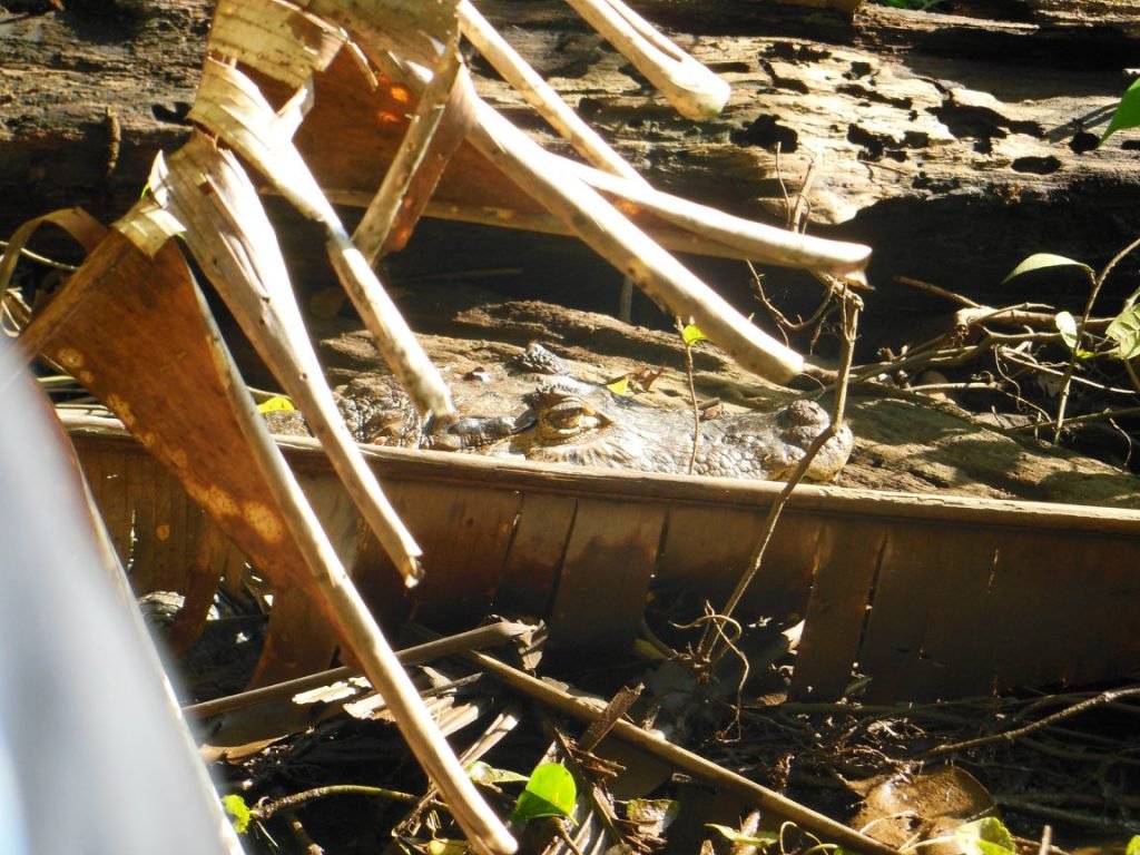 We get up (little rested because of the oppressive humidity) early in the morning, as the excursion starts at 6 a.m. It is a guided excursion on a small boat, with which we reach the highlights of the park. It is quite hot, but we have to be careful not to get caught up in putting our hand in the water to cool off, since we risk it becoming a meal for the crocodiles. Otherwise, all is absolutely safe. Speaking of crocodiles, shortly after getting on the boat, we spot a beautiful caiman a few meters away from us with her young cubs, a very cute scene.