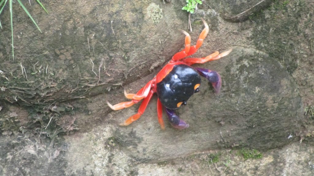 The surroundings of the park are also quite remarkable. Very particular are the crabs, there are lots of them and they have very unusual colors. We also see quite a few near our bungalow, which moreover has a spectacular view of the sea.