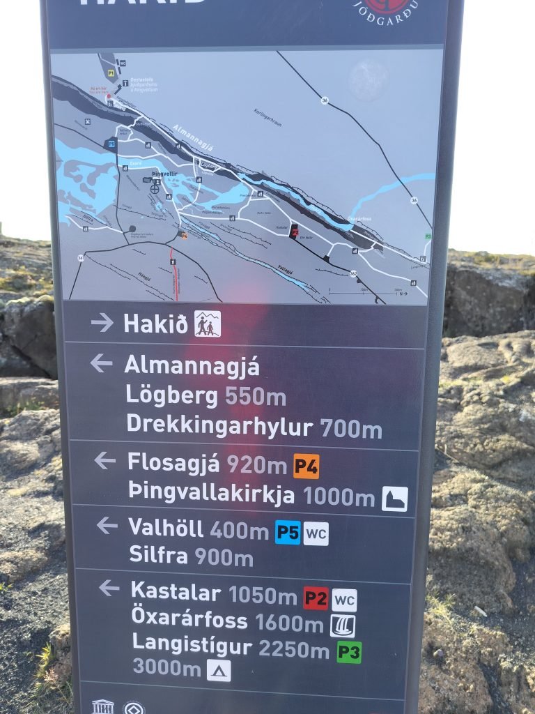 We thus begin our on-the-road journey by getting up very early, of course, in view of the approximately 350 km of total roadwork planned for the day. Leaving Reykjavik, our first stop is Thingvellir National Park, which hosts within itself several notable spots. Our main targets are the Oxarafoss waterfall and the Almannagja Gorges, to reach which we pass by all the other attractions located along the trail, with unpronounceable names, which you see listed in the image below with their relative distances to travel.