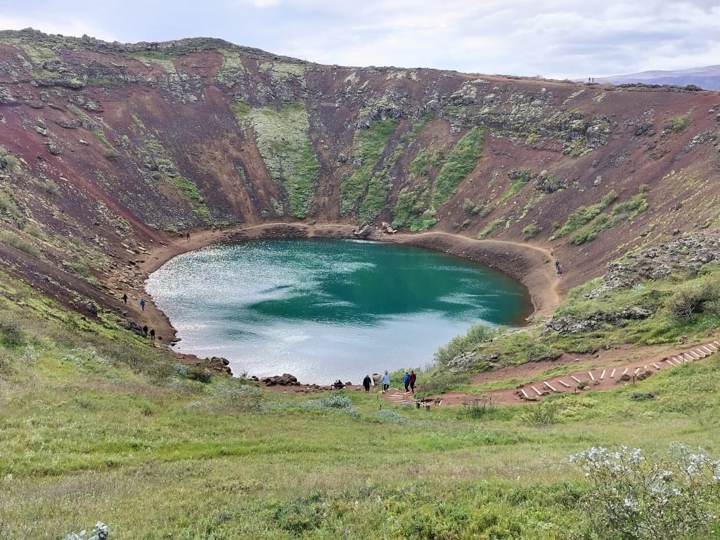 Next, we make our way to Kerid, a crater within which there is a small green lake that is very impressive, which we reach in about 45 minutes by car, arriving around lunchtime. There is no charge for parking, but a visitor’s fee of 600 ISK (about 4€) is required. There is a path on the rim of the crater that can be walked in a few minutes and allows you to appreciate it from different angles. It is also possible to descend inside it to the pond, located at a depth of more than 50 meters from the highest point. Again, this is all done in a good hour or so.