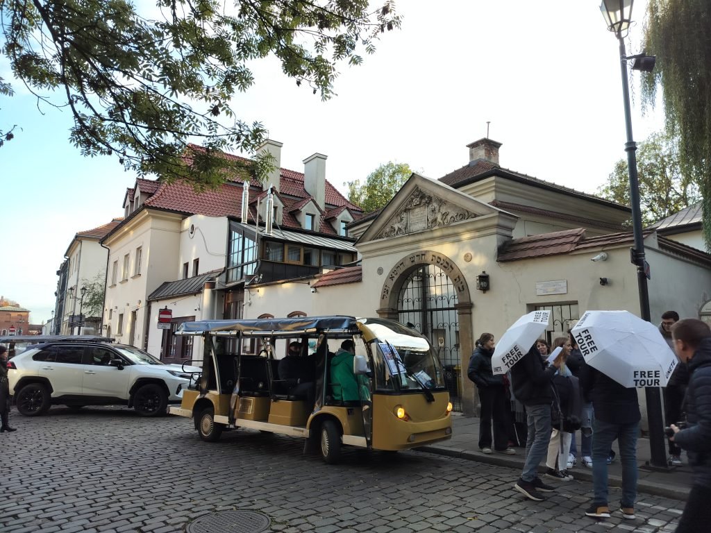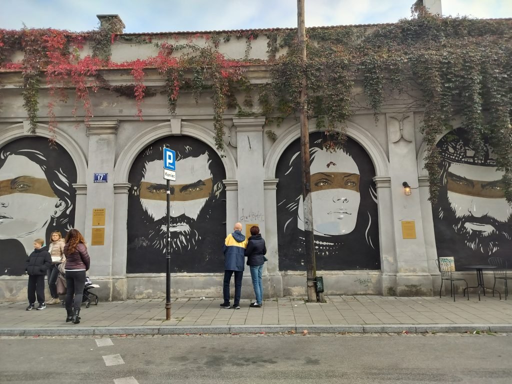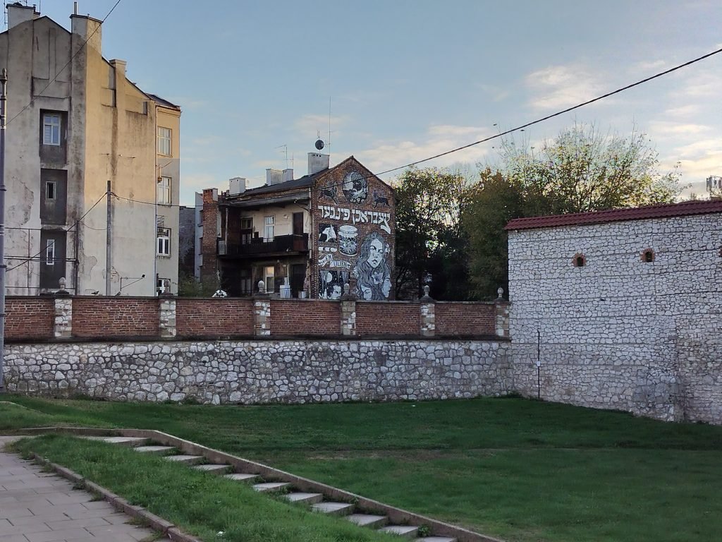 Since we still have a few hours before dinner and the light allows it, we decide to head to the Jewish Quarter (Kazimierz), once again booking a cab through Bolt. We arrive in a few minutes and head to the Remu’h Synagogue, the most important in the city, and its ancient cemetery. We observe the various buildings and murals in the streets as we walk. It feels like we are in a completely different city.