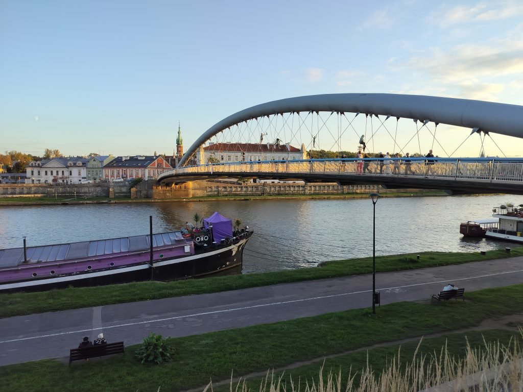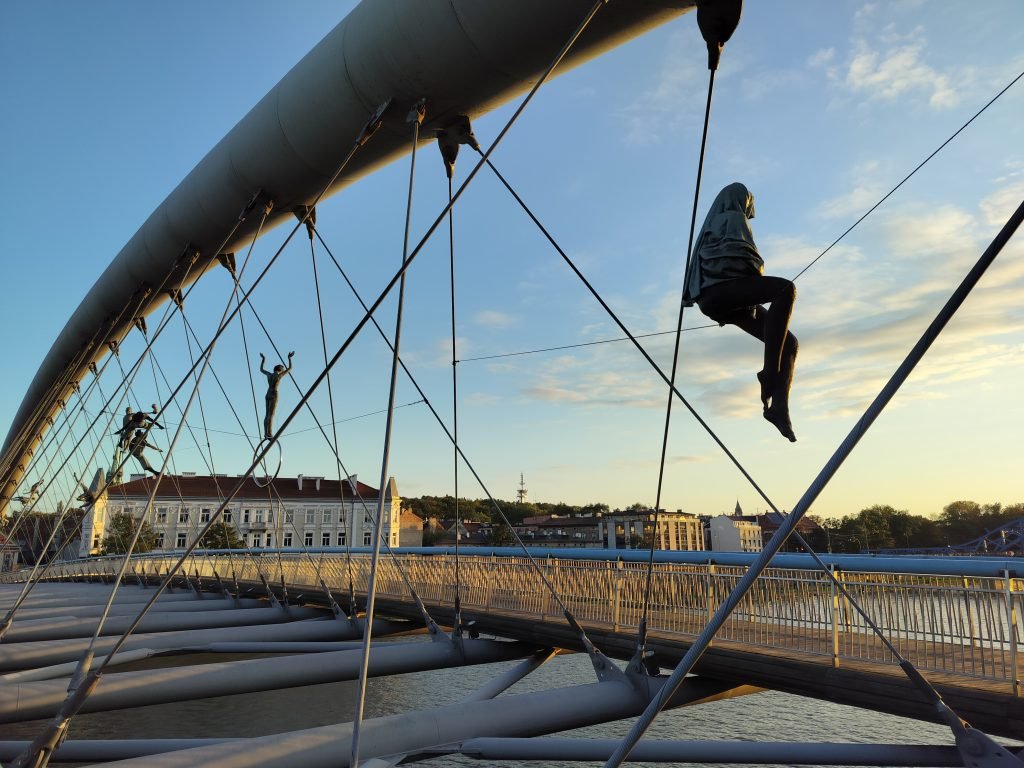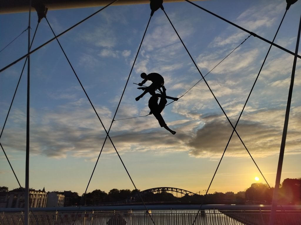 Dusk is approaching at this point, so we decide to wait for it as we reach the Vistula, indulging in a leisurely stroll along the banks of the river, until we reach Bernatek’s Footbridge, a very striking modern bridge that features statues sculpted between the tendons of the structure by a contemporary artist .