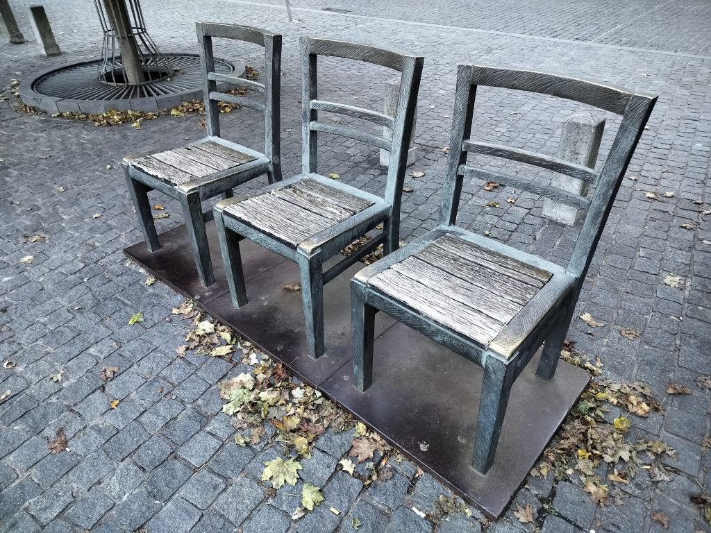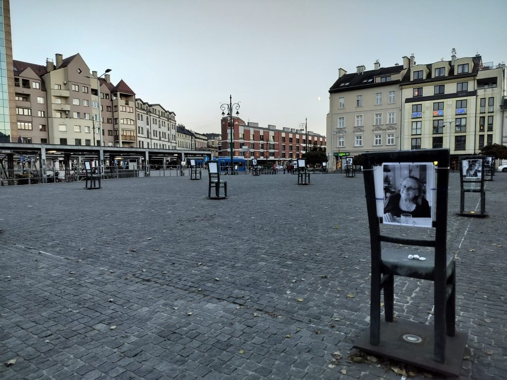 After crossing the bridge, we close the circle with a visit to the Square of the Heroes of the Ghetto (Plac Bohaterow Getta), the place where Jews were rounded up before being driven to the lagers of Auschwitz and Birkenau. The square features metal chairs, installed in the early 2000s, in memory of the tens of thousands of deportation victims.