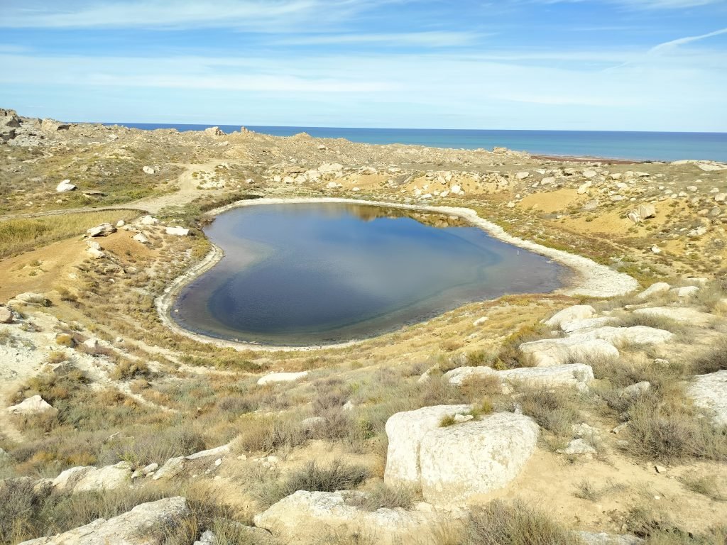The visit to the site begins at the viewpoint located near the car park, which offers a wide view of the depression and a glimpse of the Caspian Sea in the distance. The landscape looks like the aftermath of a devastating landslide. After taking the usual photos at the viewpoint, we enter the canyon to reach Lake Kuzdakary, with its characteristic heart shape. The descent to the lake is short but more challenging than expected. In fact, according to the guide, in the warmer months, many people are unable to reach the lake and prefer to turn back. The lake is dark in color and has a very high salt concentration.
