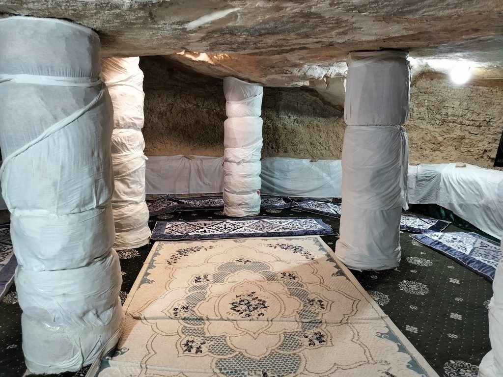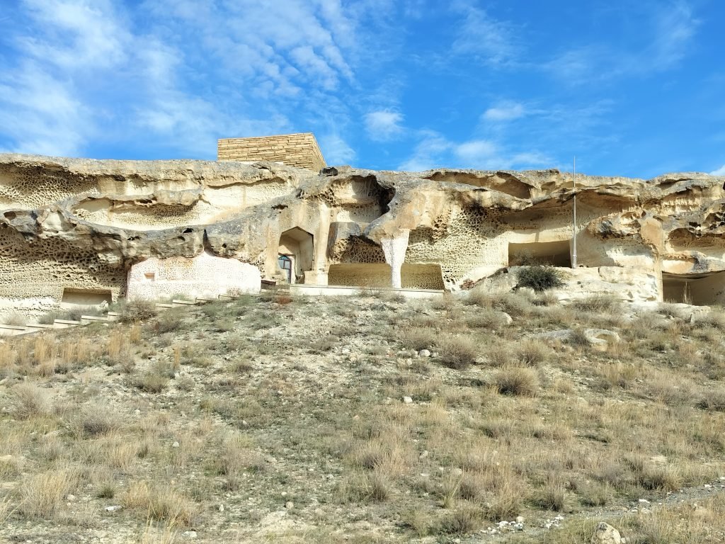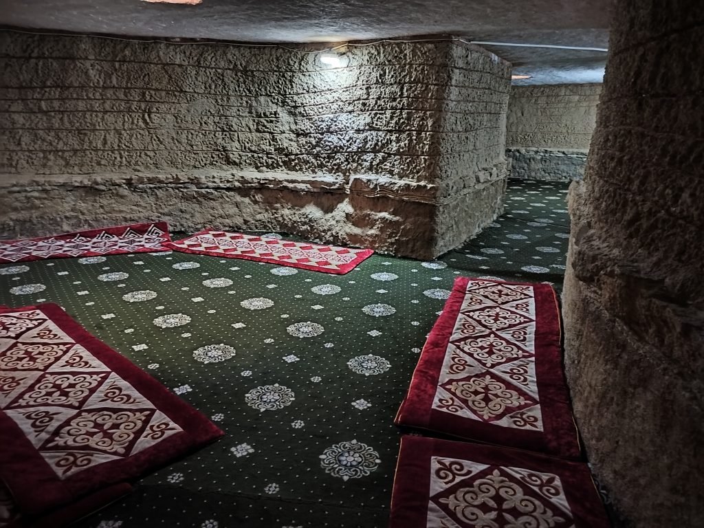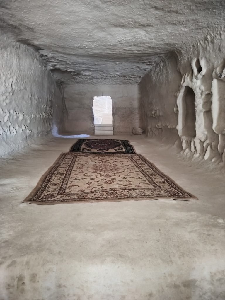 We have lunch near the viewpoint once we return from the lake, enjoying some excellent pasta cooked by our drivers. After lunch, we head to the second stop of the day, the underground mosque of Shakpak-Ata. The mosque dates back to approximately the 14th-15th century and is dedicated to Shakpak-Ata, a figure linked to Sufism (a spiritual branch of Islam) who lived as a hermit within its walls. The mosque, which overlooks a necropolis dating back to the 13th/14th century, has a cross-shaped plan and is characterized by the porous structure of its limestone walls, resulting from erosion by the Tethys Ocean.