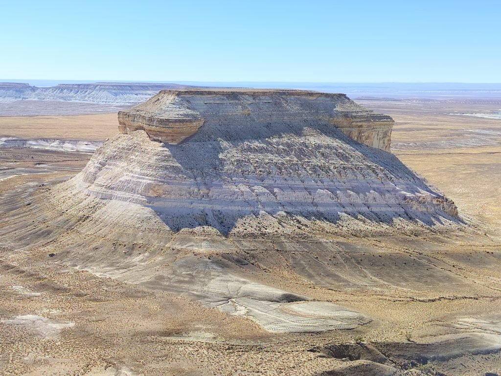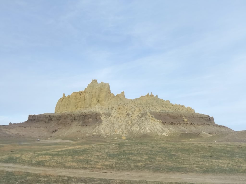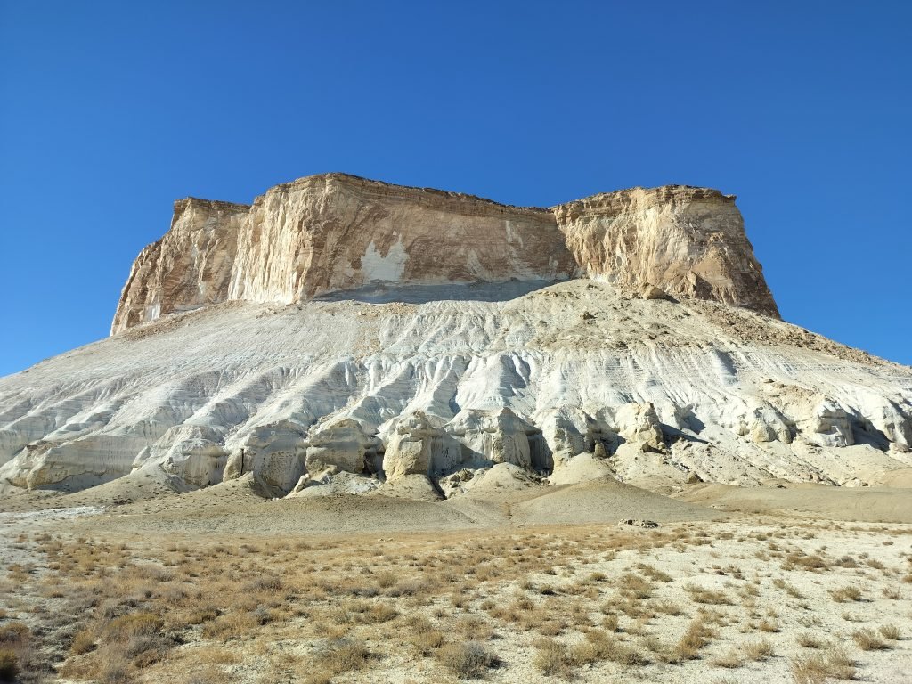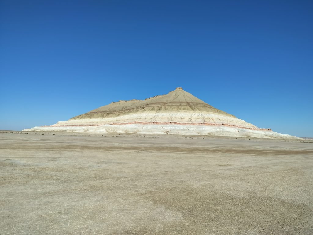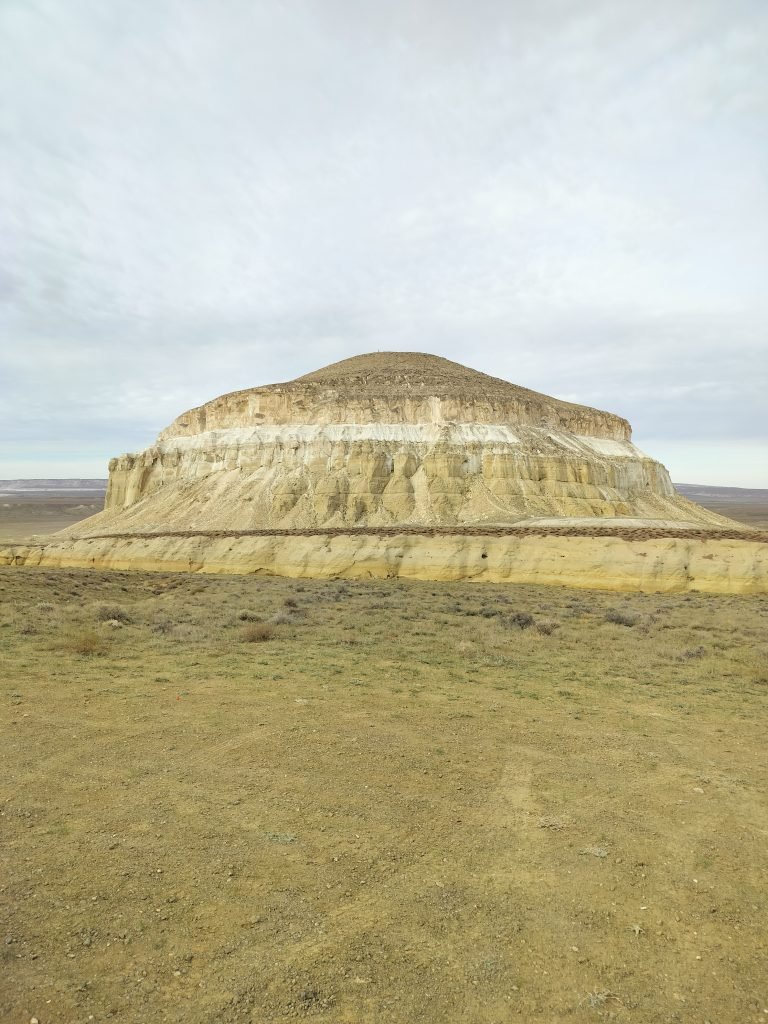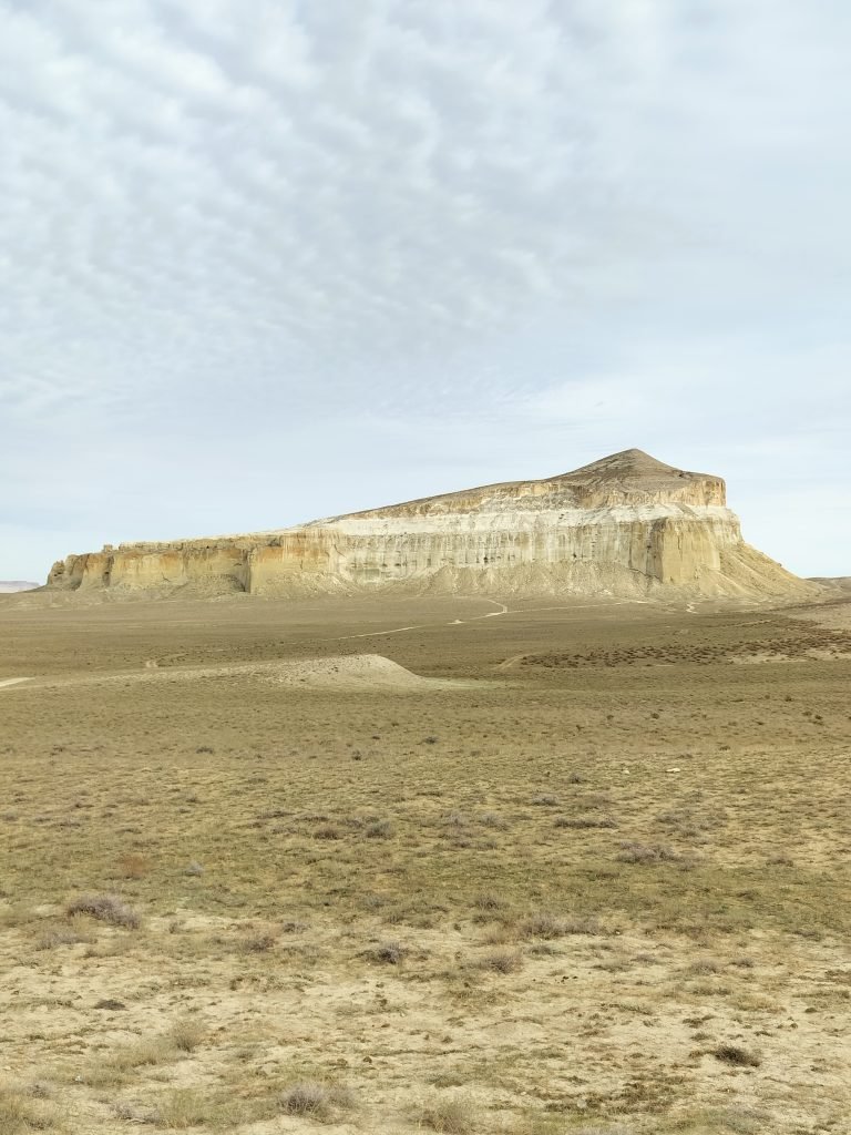 Once we have explored Kokala Canyon, we head towards Mount Sherkala, officially included in the list of monuments of particular historical and cultural value in Kazakhstan. It is an imposing 308-meter-high mountain consisting mainly of gypsum, which rises in the middle of a wide steppe expanse. Its name means “lion mountain” and derives from the fact that the shape of its longest profile resembles, with a little imagination, a crouching lion. Its shortest profile, on the other hand, looks a bit like a yurt.