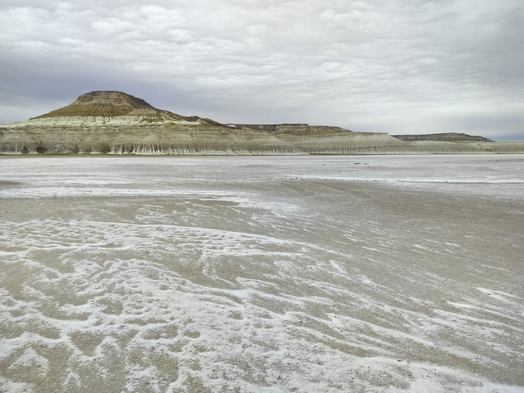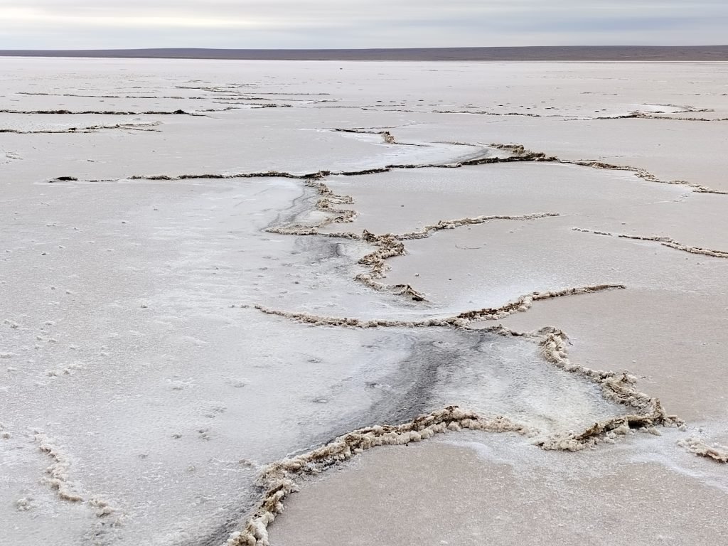 We start the day by visiting Airakty again early in the morning and then get back in the car to head for the salt flats of Tuzbair, which we want to explore far and wide. We arrive at the site after lunch, which we eat in a village again (so we are connected to the network for the duration of the meal). Unfortunately, it is very windy and the sky is overcast, which prevents us from fully enjoying the place, although we still manage to appreciate its charm.