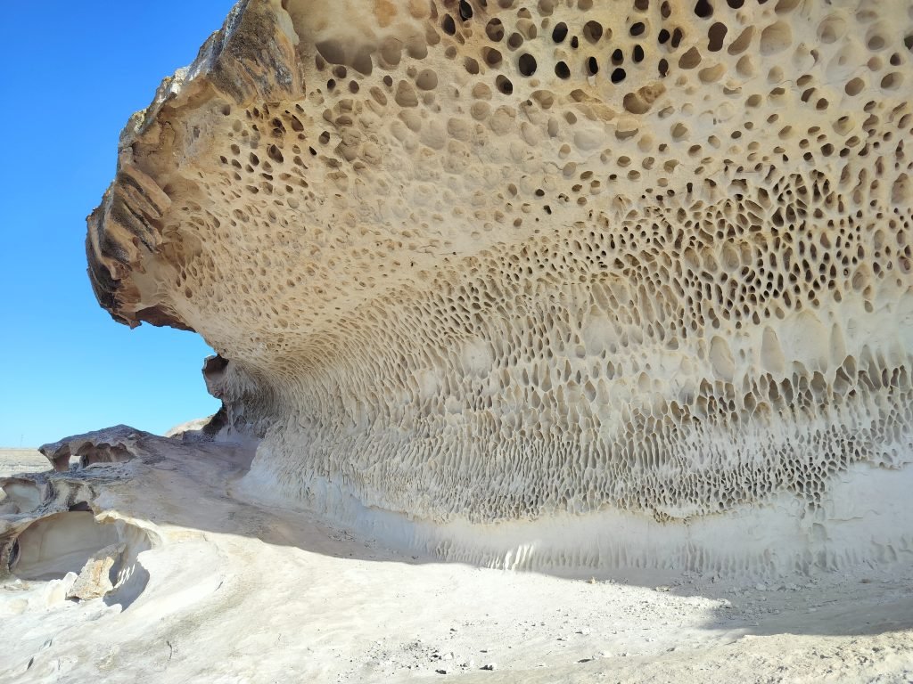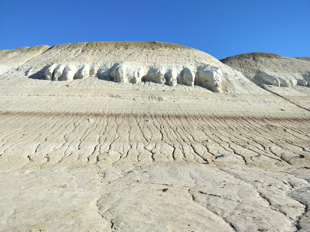 The visit to Tuzbair is divided into two parts, the first dedicated to exploring the lower part and the salt flats, and the second to the incredible view offered by the panoramic viewpoint at the top. The place is characterized by white chalk and limestone cliffs smoothed by the elements and the Tethys Ocean. The most distinctive feature of the cliff is the so-called arch, a formation that stands out among the ridges. It is all truly beautiful.