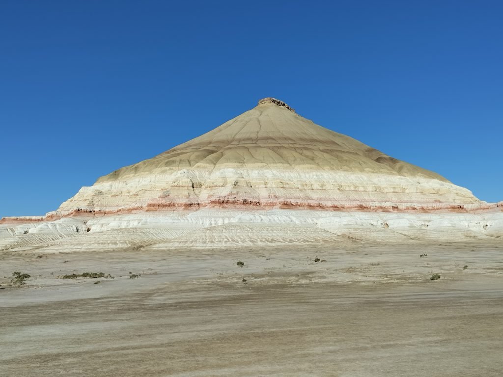 We then move a few meters to get a closer look at Mount Bokty, a small mountain 165 meters high with a flat summit and the same color shades as the Kyzylkup mountains. You can see the mountain in the distance from the Tiramisu Canyon. Mount Bokty dates back to the Cretaceous period and is one of the region’s best-known attractions, partly because it is depicted on the 1000 Tenge banknote. The visit to the mountain is fairly quick, just enough time to try climbing a little and take some photos.