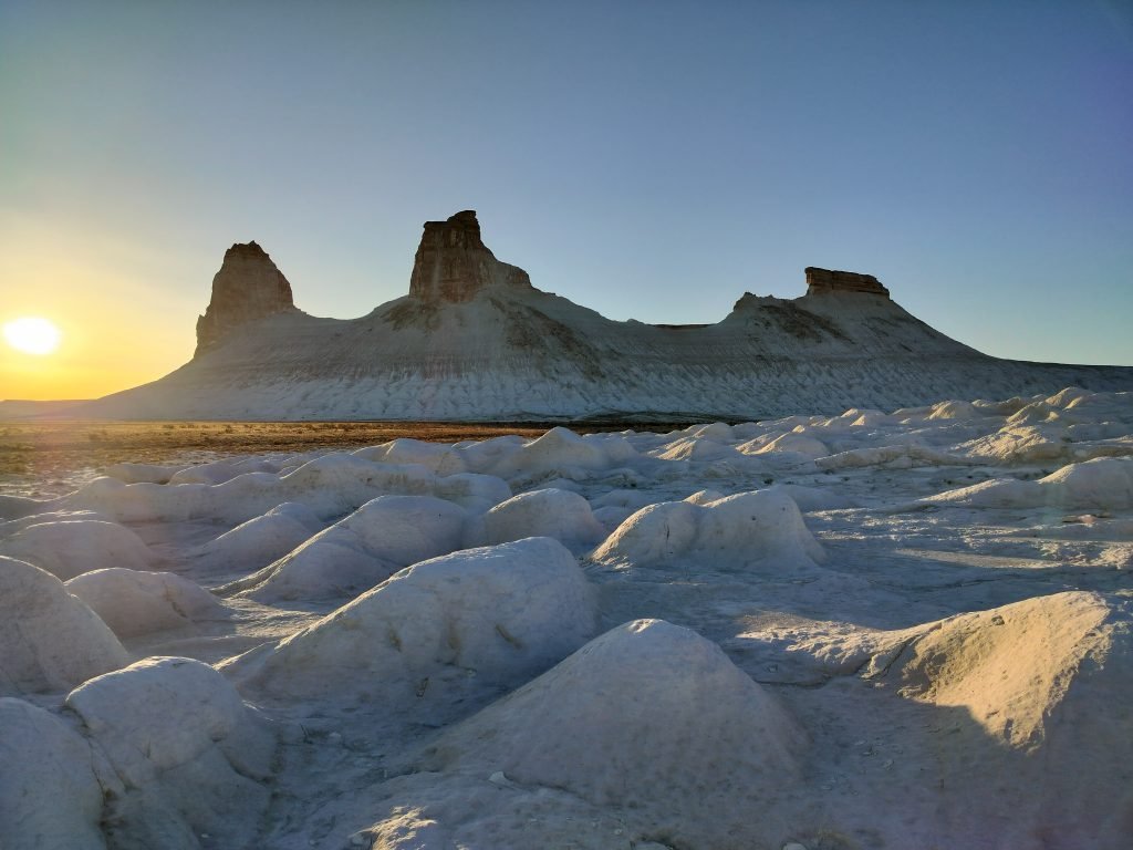 At this point, we leave Kyzylkup and head towards the attraction that, according to the guidebooks, is the highlight of Mangystau: the Bozjyra Valley. After seeing the Tiramisu Canyon, I find it hard to believe that its beauty can be surpassed so easily, but in the end I agree that it’s a fair draw. The Bozjyra Valley offers a completely different scenery from Kyzylkup, with white as the backdrop to incredible and boundless landscapes. It is no coincidence that the term “Bozjyra” means “Valley of Faded Colors.” The white color of the rocks derives, once again, from their composition, mainly chalk and sandstone. Compared to Kyzylkup, it can be said to be less picturesque but more majestic.