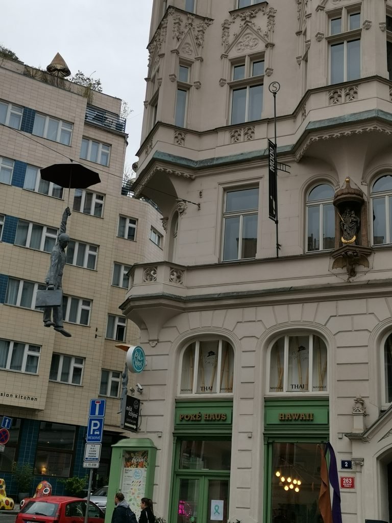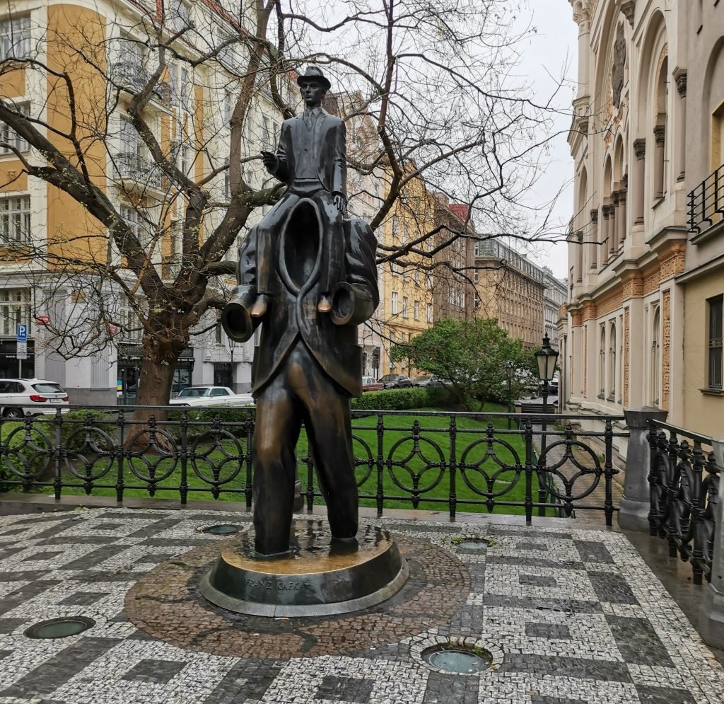 - The monument to Franz Kafka, inspired by one of his stories, which depicts the writer in small size on the shoulders of the same writer without his head in larger size. The statue is located near the house where Kafka lived for several years.