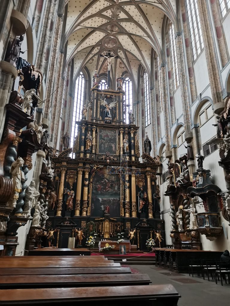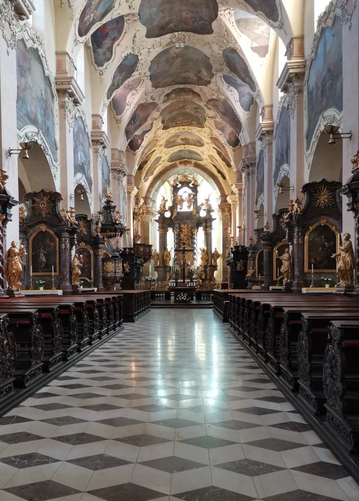 Next, we arrive at the Church of St. James, the second largest church in Prague after St. Vitus Cathedral. The church is recognizable by the three Baroque reliefs on the façade, depicting St. Anthony of Padua, St. Francis of Assisi, and St. James. The most interesting part of the church is the interior, with its beautiful frescoes and decorations, as well as, for the more curious, the mummified arm visible at the entrance, which according to legend belonged to a thief who tried to steal the jewels from the altar but was stopped by the statue of the Virgin Mary.