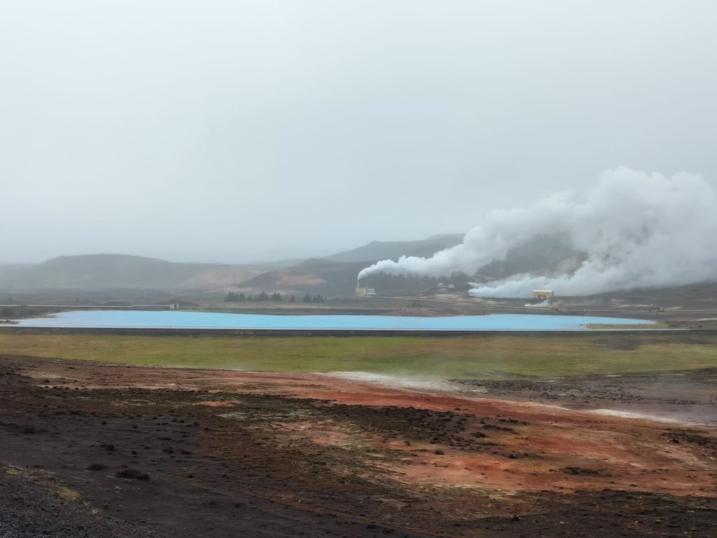 We then proceed to the Bjarnaflag geothermal station, a few meters from Hverir. Here, you can already see a bright blue water basin from the road. The visit here is very brief, just enough time to park and take a few photos.