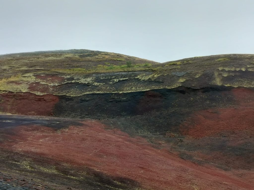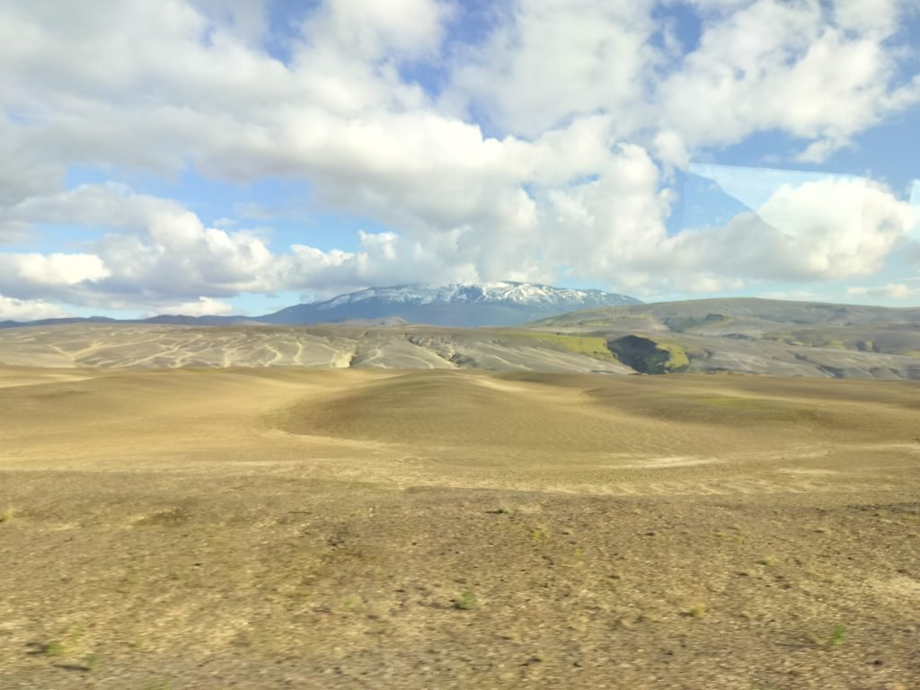 During the bus ride, we observe the lunar landscape that surrounds us, catching a glimpse of the Hekla volcano in the distance.