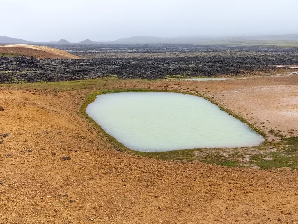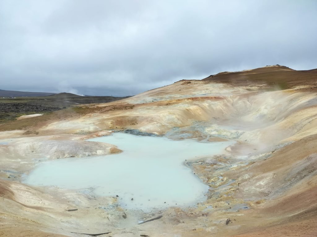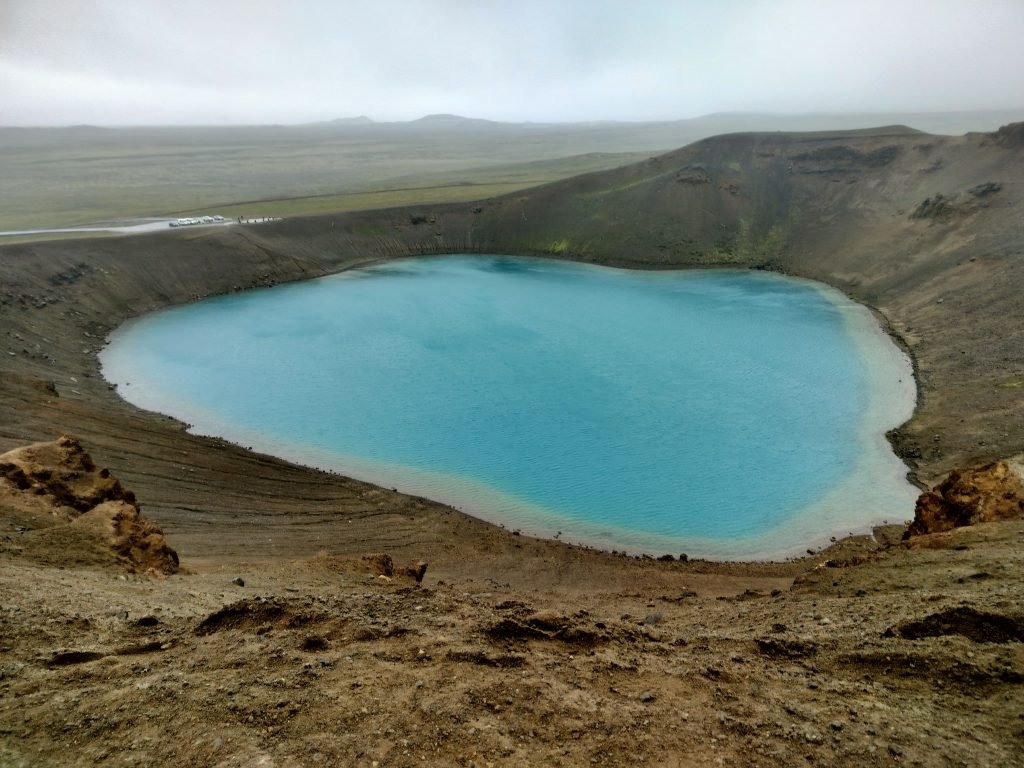 We then continue towards Krafla, where there are two main attractions: the Viti crater and the Leirhnjukur fumaroles. We start with the crater, which is easily reached from the parking lot. The visit consists of an incomplete tour of its ring, which would be quite simple if it weren’t for the rain and wind. Unfortunately, however, we are not so lucky, and my shoes soon become one with the mud, which rises in clumps as I walk. On the descent, it feels like being on a ski slope, with mud instead of snow. The view, however, is incredible. The lake formed in the crater is bright blue, and after walking a little, we catch a glimpse of a truly picturesque landscape.