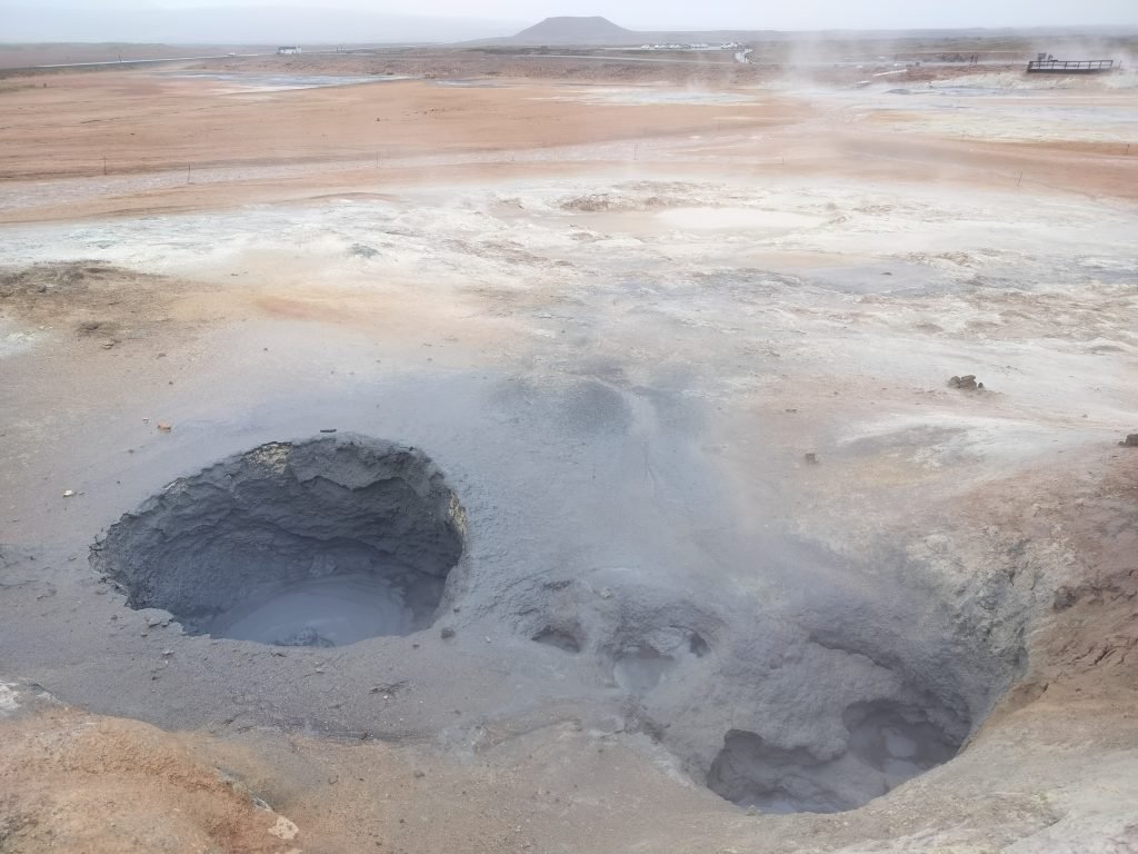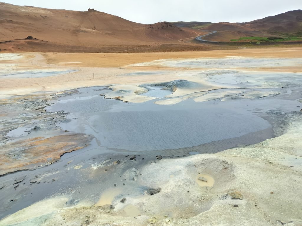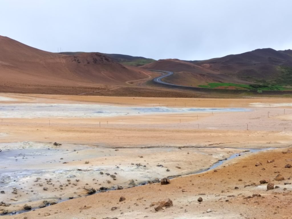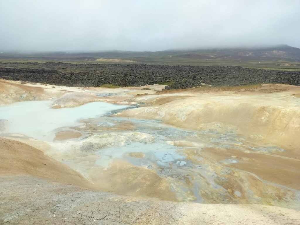 After visiting the crater, which took us a good half hour, we arrived at the Leirhnjukur sulphur springs in just a few minutes. From the parking lot, we took a trail that branched off into three other trails, all of which were quite short. It took us an hour and a half in total to walk all of them. They are close together and well marked, offering different sights along the way. It is important not to step off the platforms at the beginning of the trail, as the heat of the ground could melt the soles of your shoes. The colors are truly beautiful.
