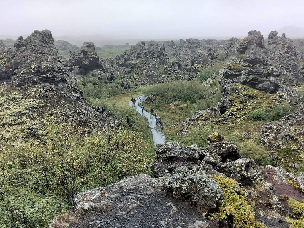 From the cave, we head towards the Dimmuborgir lava field, where, among other things, we find a restroom. I mention this because we had a lot of trouble finding one in the whole area, so it might be useful to know. It is raining heavily and very windy, so we take a rather quick tour. However, we see a beautiful lava landscape. You can also take a photo from above from the terrace of the small shop next to the bathroom. In the background, you can also see the Hverfjall crater.