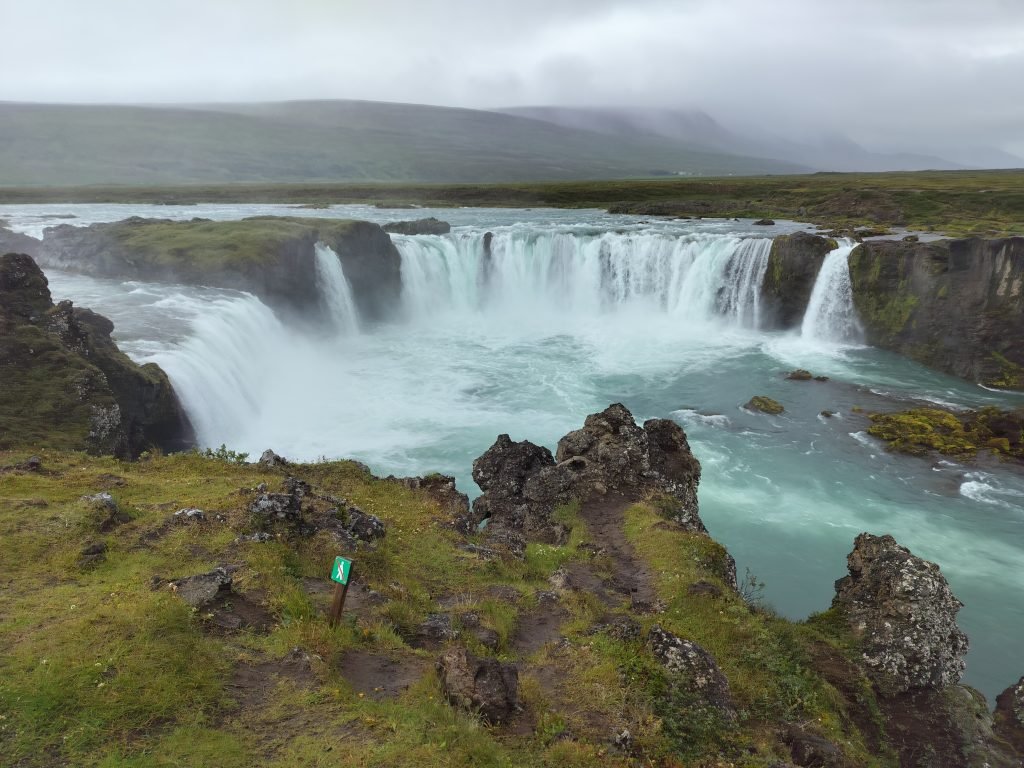 After this overview of volcanic landscapes, we resume our journey along the Ring Road towards Godafoss, the waterfall of the gods. In just a few kilometers, the scenery changes dramatically. We arrive at the waterfall in just under an hour and immediately set off on the short path that leads to the waterfall in about ten minutes. It is very cold and there is a fierce wind, so we only stop for a few minutes to admire this other wonder of nature.