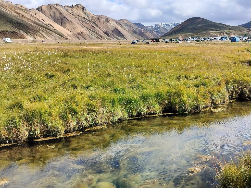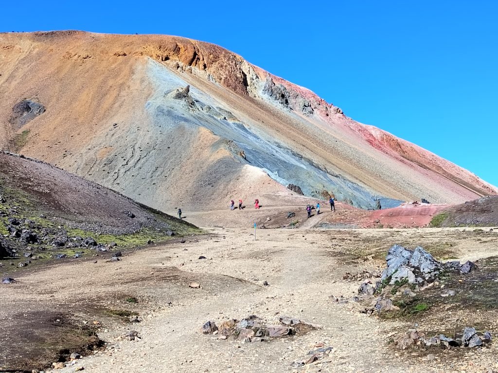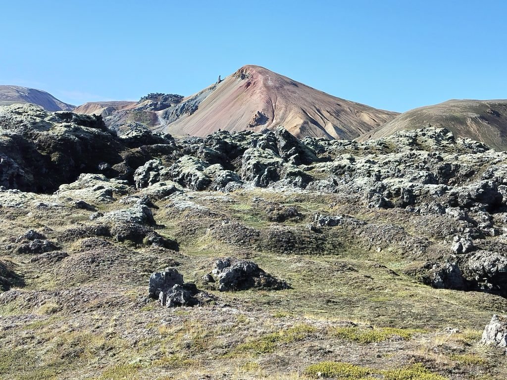 We arrive at the Landmannalaugar campsite around 11 a.m., about half an hour ahead of schedule. The return trip is scheduled for 3:45 p.m., so we have about four and a half hours to explore as much as we can. There are several trails, from shorter ones that can be completed in a day to longer ones that take several days. Among the latter, the most famous is the Laugavegur, about 55 km long, known as one of the most scenic trails in the world. Among those that can be done in a day, in order of difficulty, are the Laugahraun Lava Field Loop (an easy loop trail, less than 2 hours long, almost entirely flat), the climb to the Brennisteinsalda volcano (medium difficulty, total time around 3 hours), and the climb to the Blahnúkúr volcano (high difficulty, total time over 3.5 hours without stops). The three trails can be combined in the Blahnúkúr–Brennisteinsalda Loop, which takes about 6 hours in total.