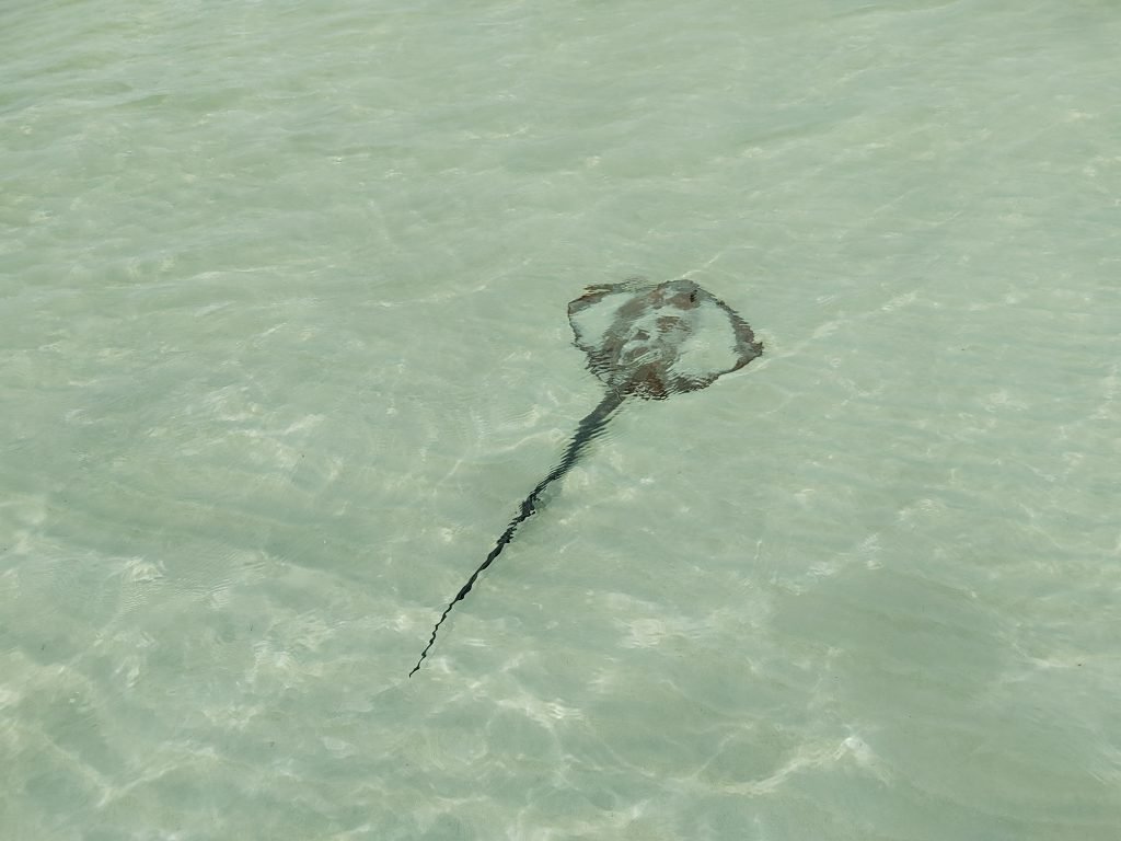 A detour from the same staircase that leads to the viewpoint also provides access to the beach, but it is not possible to stay there for long. Aware of this, during the second excursion we decide to skip the stop at the viewpoint to enjoy a few more minutes on the beach, ahead of the rest of the group. The beach is truly wonderful, and already at the shore you can see lots of stingrays lying in wait.