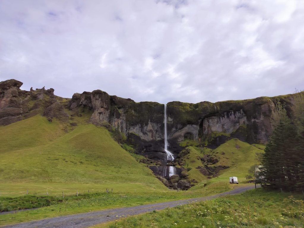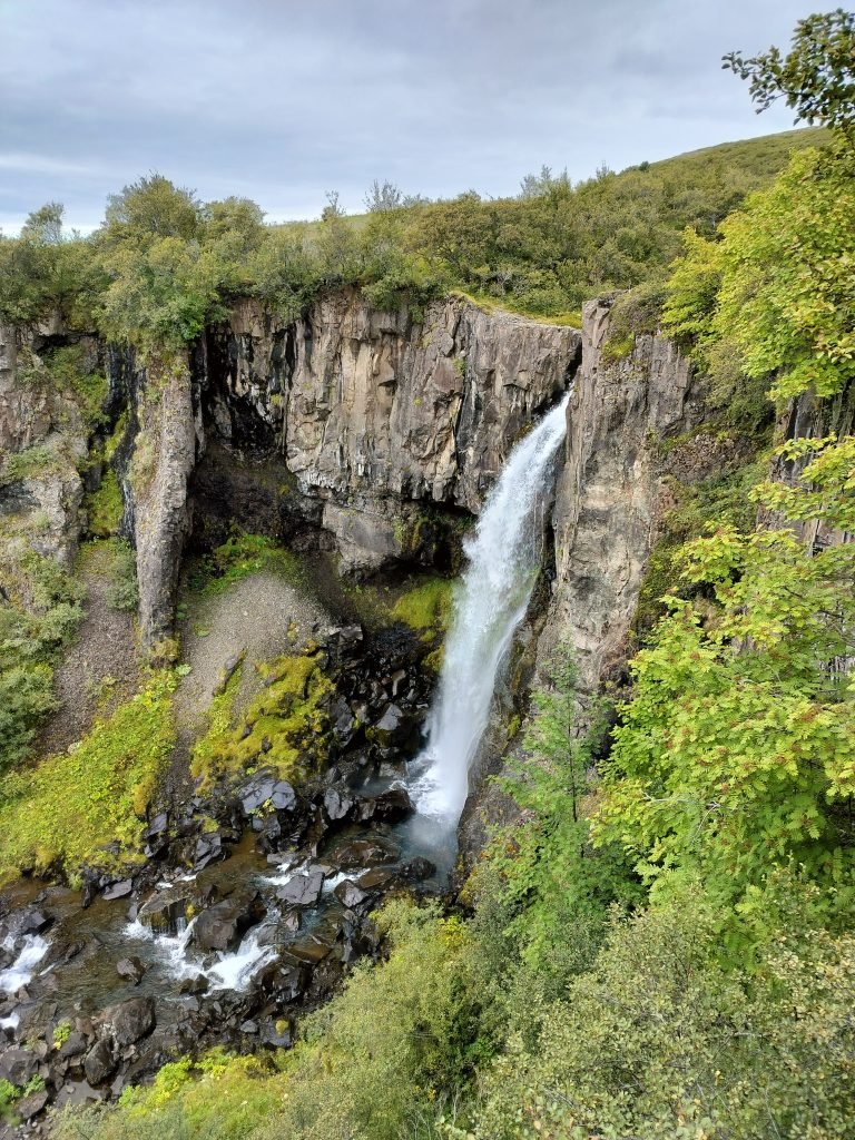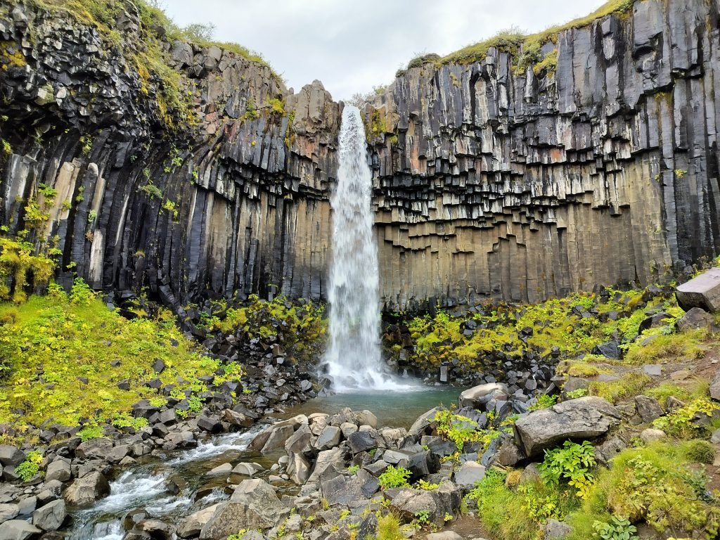 Leaving the canyon parking lot, we continue our adventure by heading to Skaftafell National Park, where we plan several activities. The first of these is to visit the Svartifoss waterfall, which is reached from the parking lot (cost again ISK 1,000, equivalent to about €6.50) by an approximately 45-minute round trip. This is a very fascinating waterfall from my point of view because of the basalt columns that surround it, but not a very large one. Including photos, you can consider an hour in total for the visit. The path to the waterfall is a bit uphill for the first part, but very doable. Just be careful if you are accompanied (or have been preceded) by rain, the ground is a bit slippery.