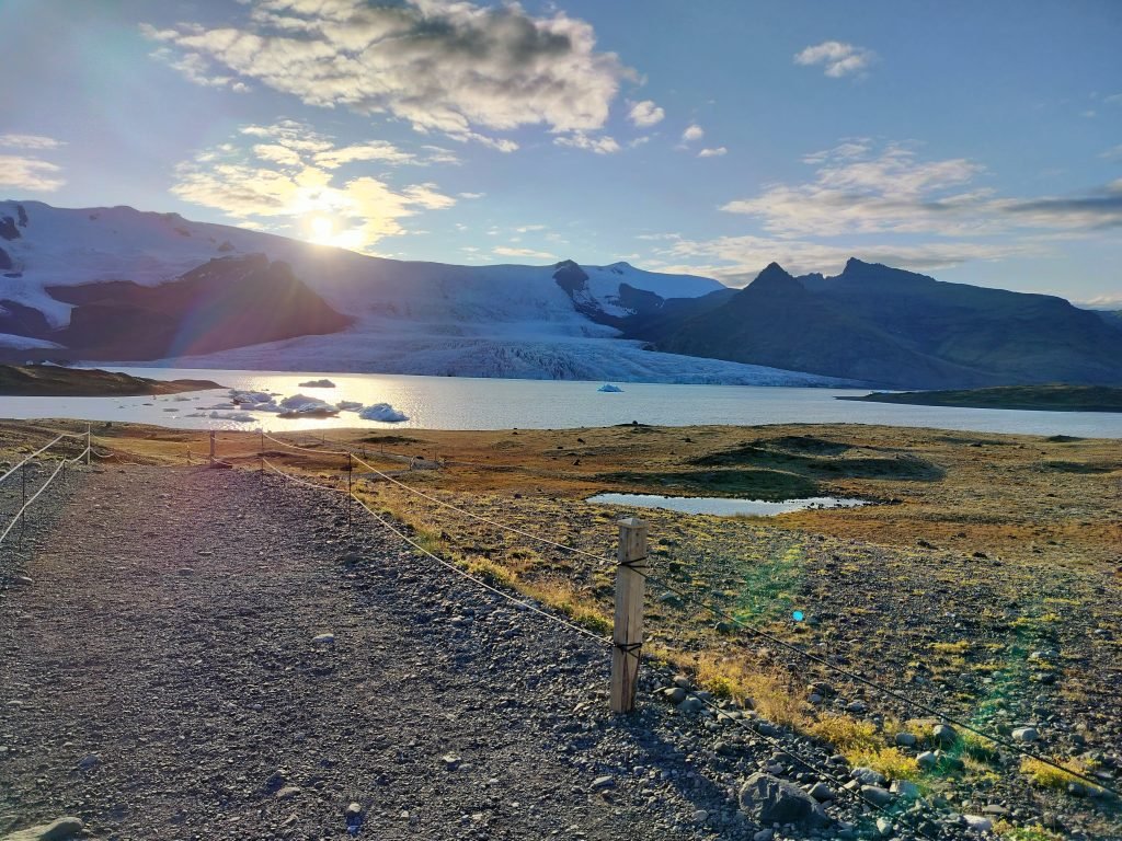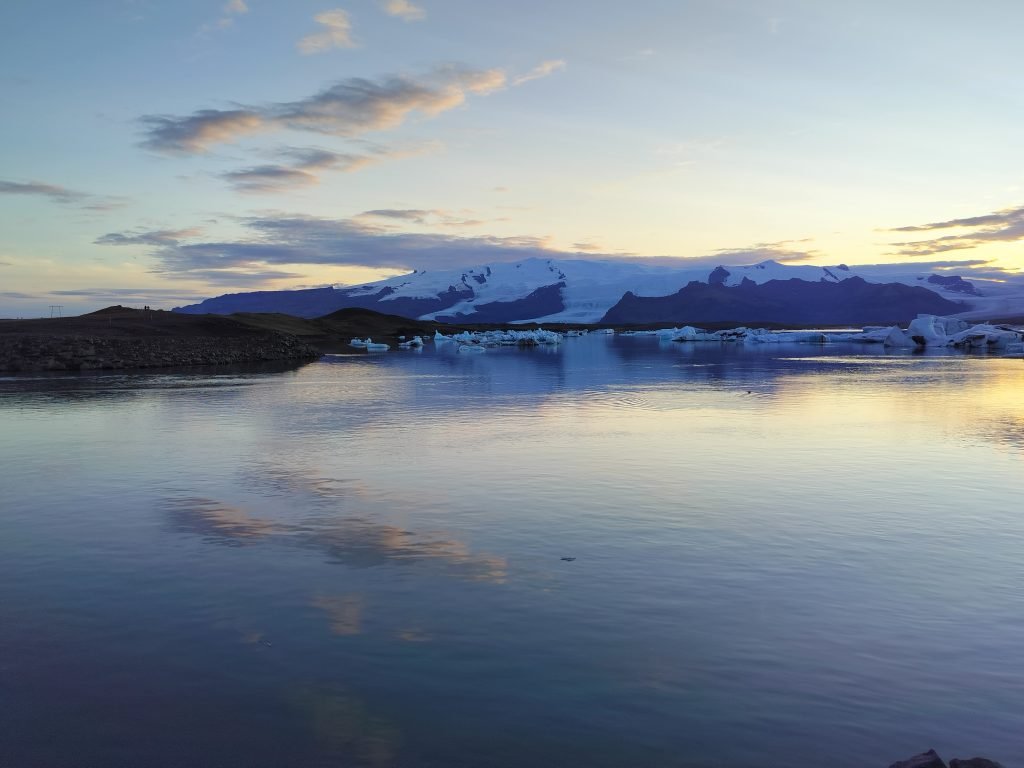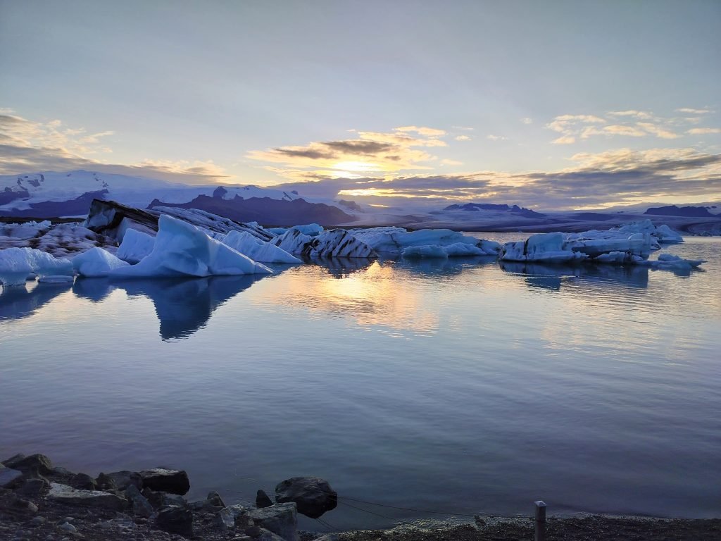 Fjallsarlon is small but very beautiful, plus it is uncrowded, so we are pretty much alone. It is possible to reach the lagoon with the icebergs by walking a trail in a few minutes. The scenery is really stunning, plus the sunset is approaching, which makes everything even more beautiful.