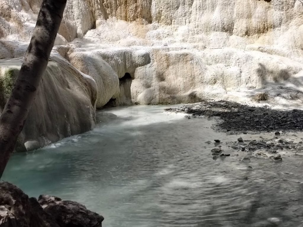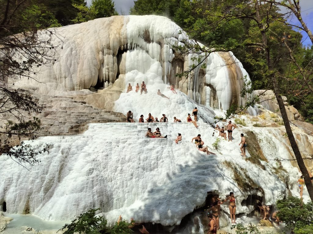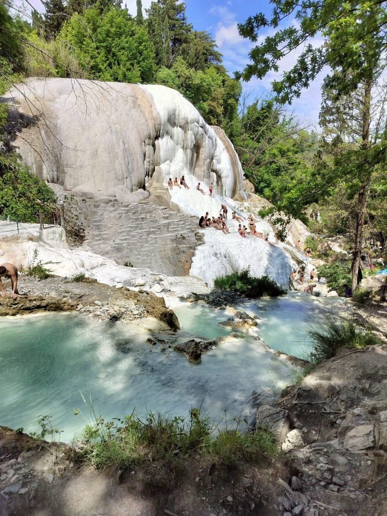 The morning of our second day is mainly devoted to bathing at the Fosso Bianco thermal baths in Bagni San Filippo. Access to the entire area is free, but be careful with paid parking. Along the way, we saw several fines on cars parked without tickets (parking is also paid on Sundays). The spa area is quite large, and the route is accessible on foot, but for those with mobility issues, it may not be ideal due to the slightly uneven and sloping terrain. The first pools you come across on the way down from the parking lot have rather cold water. To find warm water, you have to go all the way to the Cascata della Balena Bianca, a limestone formation formed by thermal water sediments, so named because its shape vaguely resembles a whale’s mouth. The rock formations are truly impressive. We stay at the thermal baths until lunchtime.