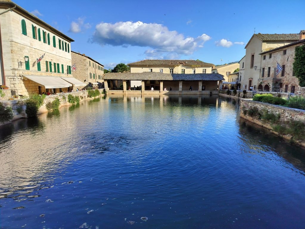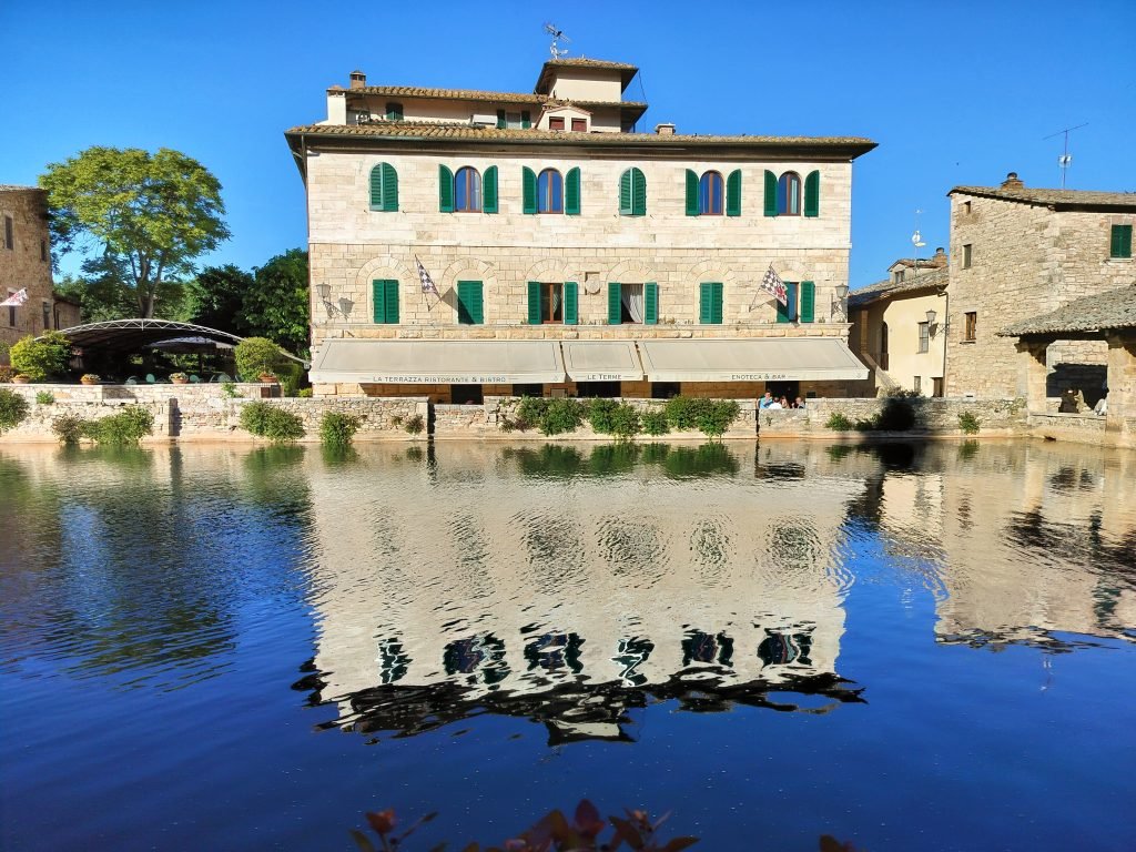 The visit to the village is very short, as all the points of interest are concentrated in the main square, Piazza delle Sorgenti. The center of the square is almost entirely occupied by a thermal bath, which is no longer in use (but still filled with water). Along the perimeter of the square, there are several buildings: