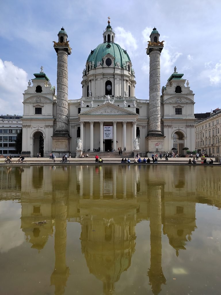 After visiting the Belvedere, we continue on to the Baroque-style Church of St. Charles, built in honor of the saint of the same name as thanksgiving, by the emperor, for stopping the plague in the early 1700s. Very impressive is to see the reflection of the huge dome of the church in the water.