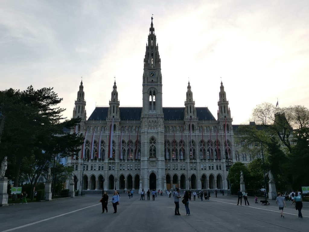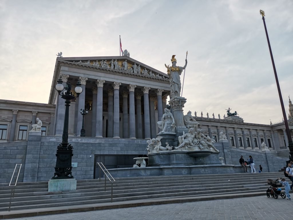 We next head to the “political” part of the city. The building most worthy of a visit is certainly the City Hall (Rathaus), in neo-Gothic style, among the most beautiful I have ever seen (as a city hall, not as a building in general). The building is quite imposing and set in a beautiful park (Rathaus Platz). Before we get to the town hall, we make a brief stop at the Parliament Square. The parliament building is inspired by Greek tradition; not surprisingly, a statue of the goddess Athena stands in front of it.