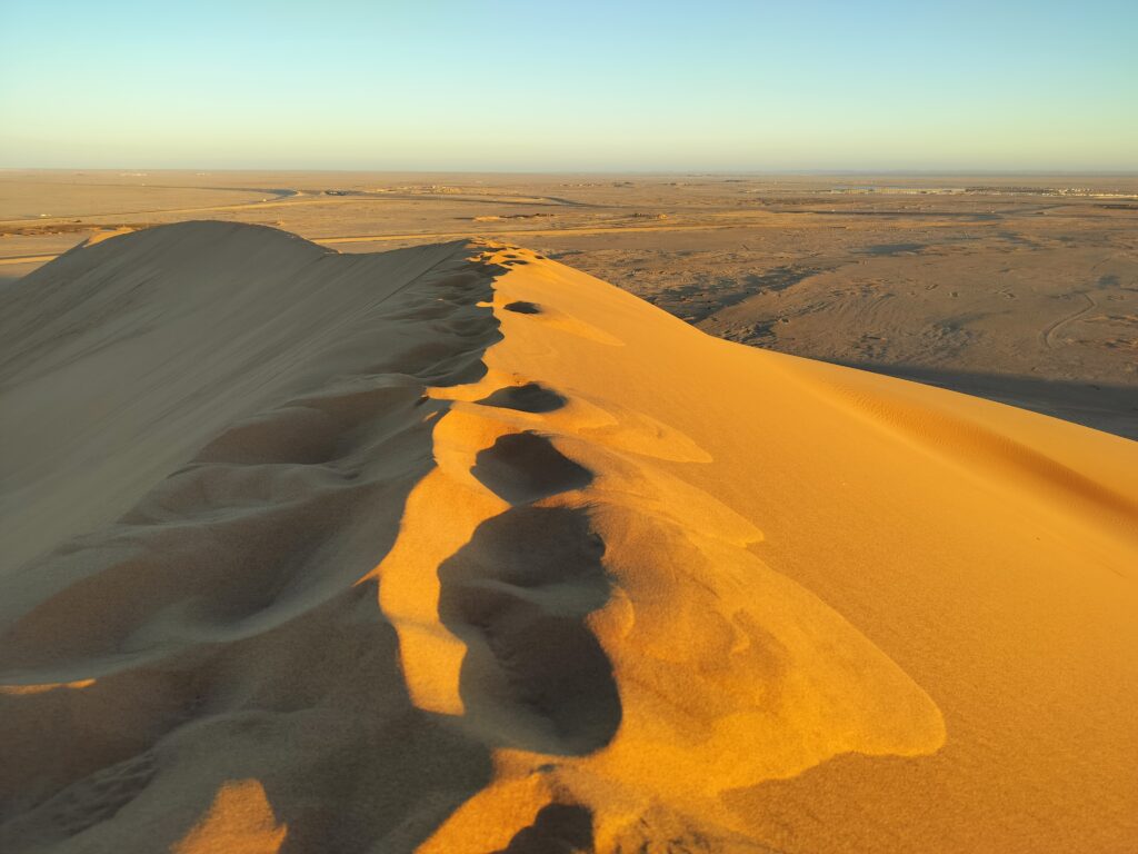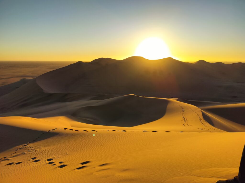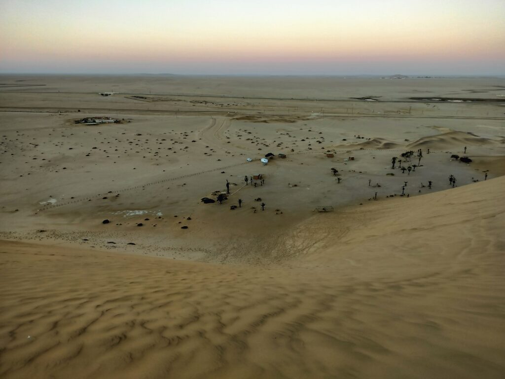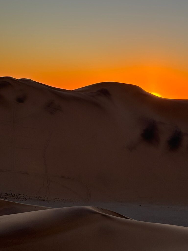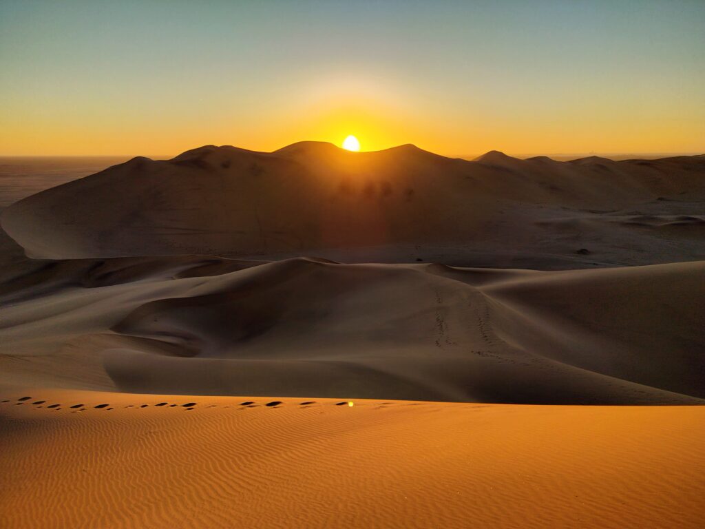 È l’ora del tramonto quando arriviamo in cima alla duna, e noi di certo non possiamo lasciarci scappare l’opportunità di osservare il sole nascondersi dietro la sabbia. Lo spettacolo è impressionante, fra i tramonti più belli mai visti.