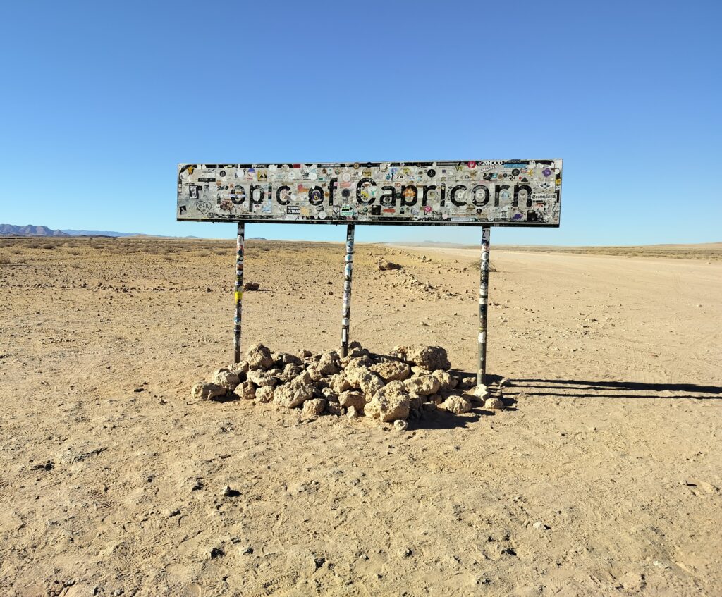 Partiti di buon mattino da Solitaire, raggiungiamo il cartello che indica il passaggio dal Tropico del Capricorno dopo circa un’ora di auto. In questo punto, sono presenti in particolare due pannelli, collocati ai due lati opposti della carreggiata. La nostra sosta qui dura giusto il tempo di scattare qualche foto, anche perché avevamo già incontrato il primo cartello indicante il passaggio dal Tropico del Capricorno lungo la strada per il Deserto del Kalahari. Rispetto a quest’ultimo, i cartelli che si trovano fra Solitaire e Walvis Bay sono un po’ più bassi, oltre che più famosi, caratteristica che li rende maggiormente soggetti all’incollaggio di adesivi da parte dei viaggiatori.